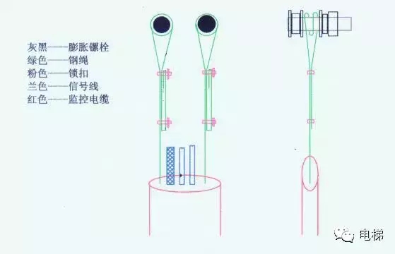 3.電梯轎廂一端的固定方法:由于不能在轎廂上采用膨脹鏍栓,所以就盡可能利用轎廂底部的園滑金屬橫梁來(lái)懸掛監控纜線(xiàn)的鋼繩;或者是在轎廂底部的垂直鋼板上鉆孔,用普通金屬鏍栓代替監控纜線(xiàn)的懸掛支點(diǎn)。